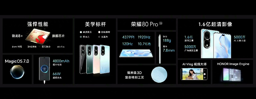 ③ 荣耀80 Pro搭载高通骁龙8+旗舰芯片,内置4800mAh电池,支持66W快充;