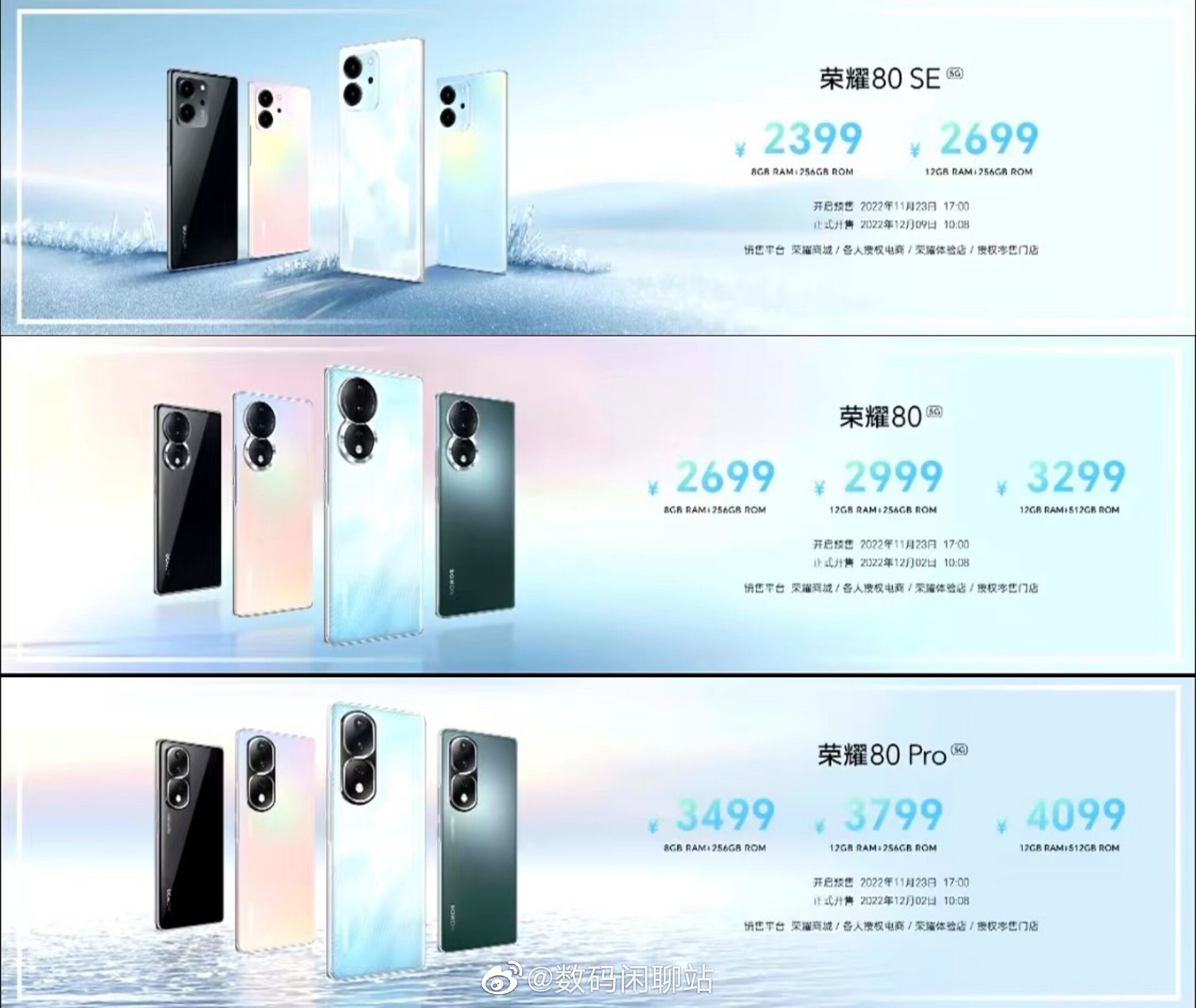 ⑥荣耀80SE :8+256GB版本2399,12+256GB版本2699;