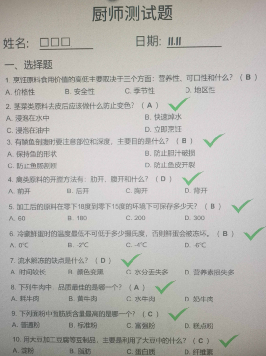 厨师证测试题
