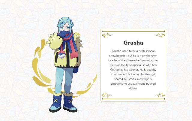 在《宝可梦 朱/紫》的英文官方网站上,可以发现这名冰系道馆馆主「古鲁夏」是以「He/Him」来做为称呼的。