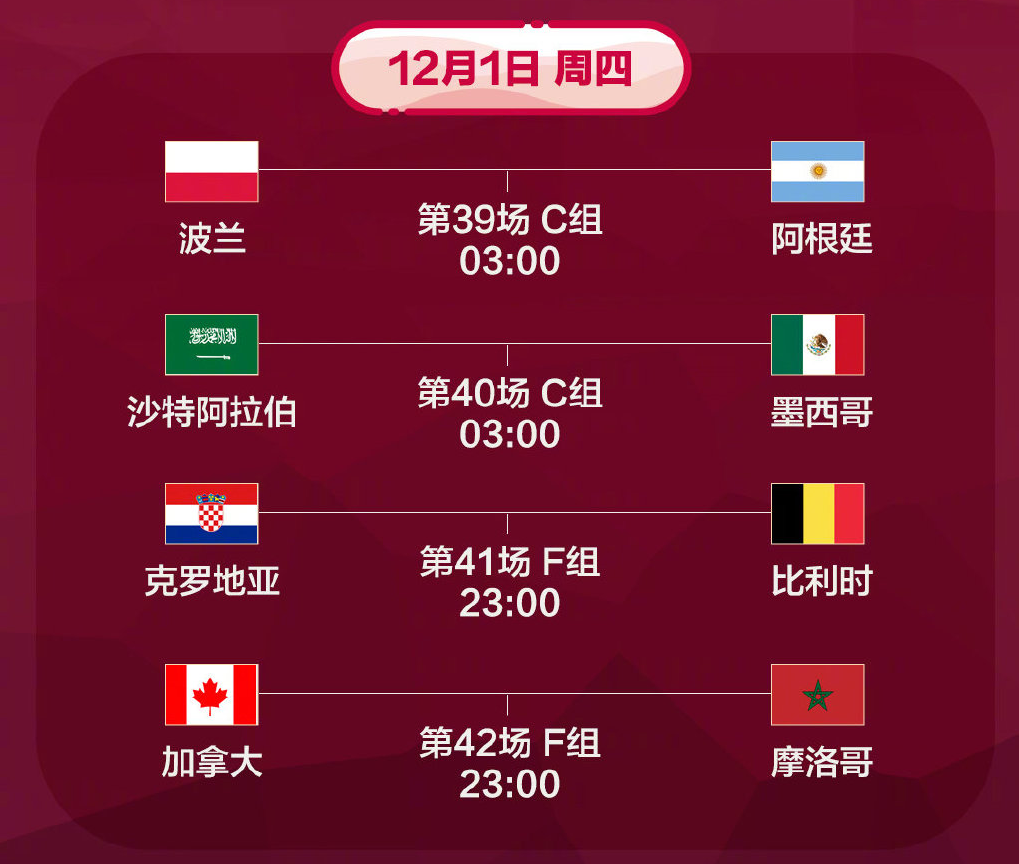以上就是卡塔尔世界杯12月1日赛程时间表的全部内容了,希望对喜欢卡塔尔世界杯的小伙伴有所帮助,更多精彩内容请关注手游巴士。以上就是手游巴士为您提供《2022世界杯赛程时间表12月1日 2022卡塔尔世界杯12.1具体赛程》的详细内容,更多精彩内容请继续阅读上一篇《宝可梦朱紫诅咒娃娃捕捉位置 宝可梦朱紫诅咒娃娃在哪》2022-11-30 游戏专用修改器有哪些 可以修改任何游戏的修改器推荐