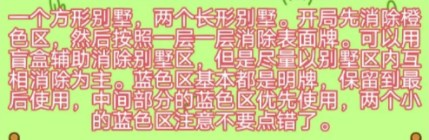 开局先消除橙色区的牌,尽量要让牌面保持在同一水平面,然后一层一层消除表面牌,不要跨层太多拿牌,等表面牌消除完后,以大别墅内互相消除为主。
