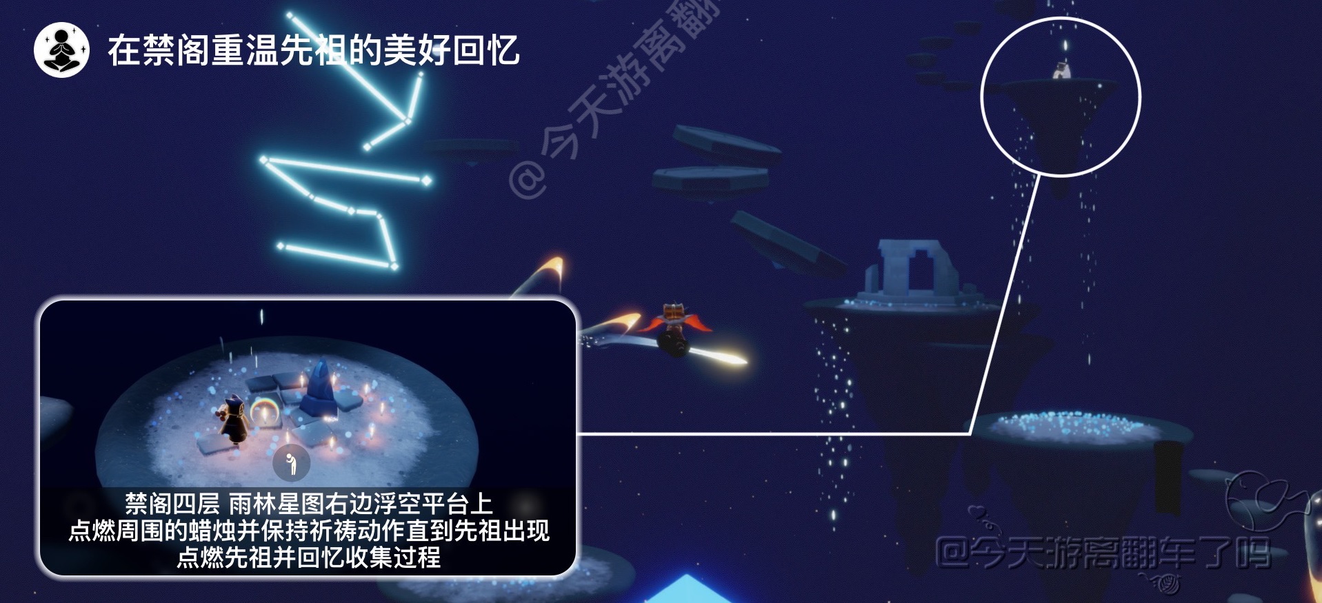 完成方法:禁阁四层,雨林星图右边浮空平台上。需点燃蜡烛摆出祈祷动作直到中间石碑完全变白,然后重温出现的先祖的收集过程。