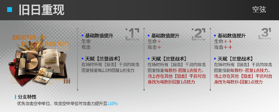 升级效果:在场所有狙击干员的攻击回复技能,每数秒-回复1点技力,场上存在其他狙击干员时,自身改为每数秒回复1点技力