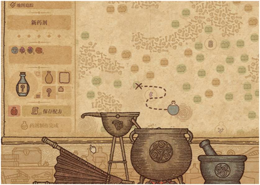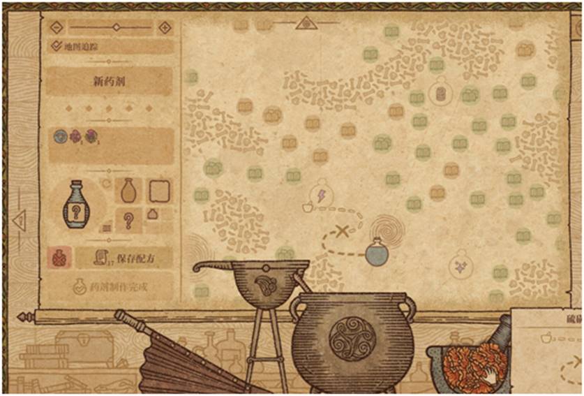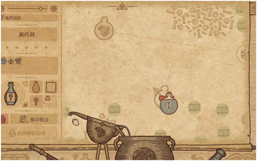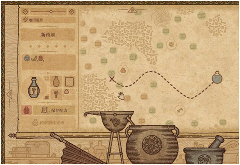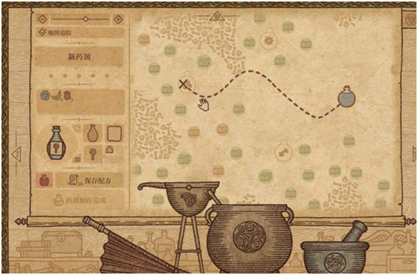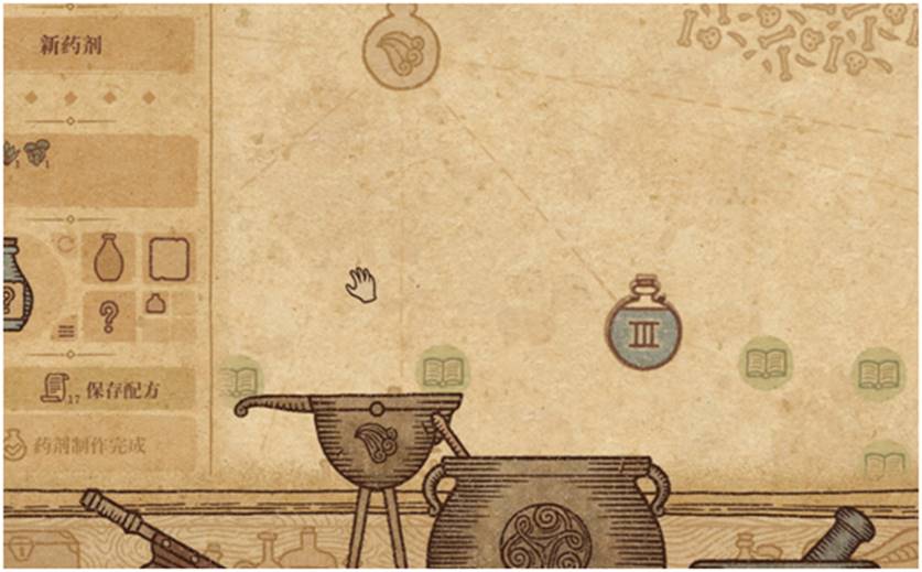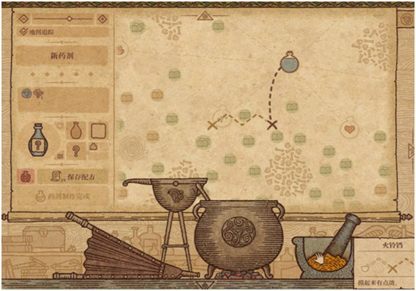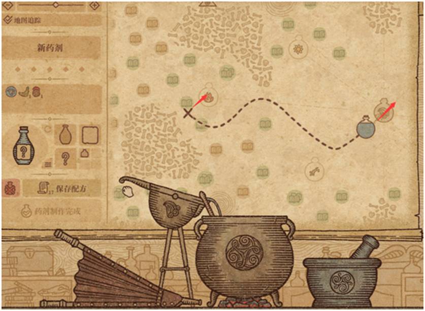 兑水微调相信许多玩家都会的,仔细看小药瓶,会有一个指向原点的线条,而地图上的药剂同样有条虚线,想要配置出三级药,这两根线便是关键。