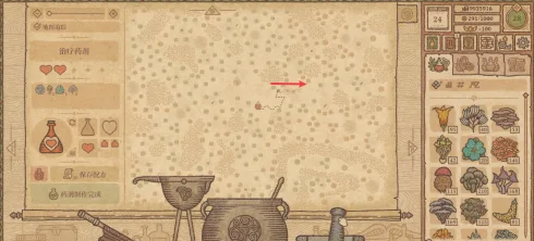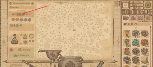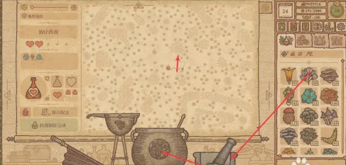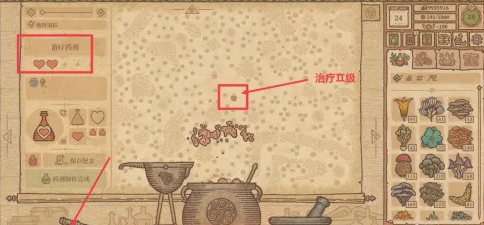搅动勺子移动到图示位置,通过加水和搅拌使治疗药剂达到Ⅱ级,按动风箱加热坩埚获得药剂。