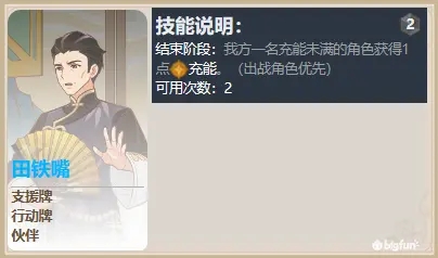 评价:T1.2。定位与刘苏相似的一张卡,二者收益相同,然而田铁嘴相比刘苏增加了1点费用,换来的是中期更低的触发要求。二者的优劣之分见仁见智,但就我个人而言,我更喜欢刘苏带来的开局展开与润滑能力,因此我给了田铁嘴稍低一些、也是它独占的一档评分——T1.2.但若有人认为二者强度相当、甚至田铁嘴反超,类似的观点我也不会反驳,这两者卡的差分化设计我个人觉得非常精妙,也可以从中一窥米哈游对七圣召唤的设计深度。