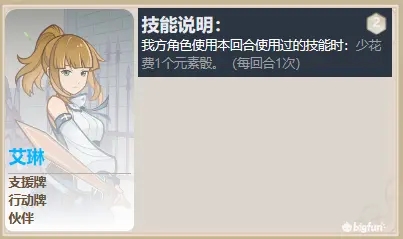 评价:T3.挺鸡肋的一张卡,在元素反应占据核心地位的七圣召唤中,连续使用某技能往往意味着亏了一次元素附着、也亏了一次反应。大家看到艾琳这张卡,第一时间想到的恐怕是普攻——毕竟普攻也视作技能、能够触发艾琳的效果。然而普攻队伍有着薄荷卷这一减费神器、没有连续使用的要求、更没有每回合1次的次数限制,配合仅仅1费的廉价启动费用,艾琳被正面薄纱。但应该注意的是,艾琳与部分角色能够实现化学反应(正e人),是这些角色配队中不可或缺的一份子。