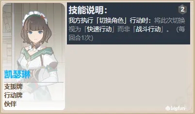评价:T1.5。快切是我个人非常喜欢的效果,不管是提速、变阵还是切人吃附着都非常有效,可以说快切把对局的博弈性提高了一个层次。凯瑟琳这张卡虽然和晨曦酒庄不同,严格来说快切本身无法产生产生任何价值,但可以通过快切打出的行动创造价值,不论是己方切人快速打出反应抓死斩杀线下的对方出战角色,还是切人吃附着打乱对方反应轴、又或者是让关键角色躲回场下。再考虑到目前七圣召唤中能提供快切效果的方式不多,仅有交给我吧、莫娜等,凯瑟琳这张卡具有非常高的战略价值,但也考验牌手的操作以及对局博弈,因此我把它排在T2之上、T1之下。