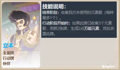 评价:立本永远的好兄弟!T1.5.我个人对立本的看法前后改观非常大——起初我认为立本是一张意义不明的废卡,因为最初在我眼里,稍有水平的玩家就不会出现余骰子这种让人血压升高的浪费资源的情况;知道我开始意识到抢先手与行动的深度,从那时起我对立本的印象也终于从废品回收卡变成了类似大派蒙的蓄爆卡:变速蓄骰抢先手,再到下回合蓄爆。但立本的资源回收与转化我个人觉得非常非常吃牌手的资源计算能力,因此只给给了他T1.5的评价,否则或许还会更上一层楼。