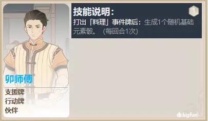 评价:非常有潜力的一张卡,以至于我一时难以给他评级。卯师傅这张卡潜力十分巨大——他再加上营养袋可以完全依靠自己形成一个料理牌小轴,双卯师傅的存在甚至能轻易实现电表倒转,然而遗憾的是现在料理牌除了极个别队伍外没有得到有效开发,大多数队伍虽然有用到,但也只是取个别料理牌加入构筑,譬如otk队伍的仙跳墙、普攻队(神宵、女仆)的薄荷卷、意继泛用性极强,啥都能带的莲花酥……目前除了一些邪道队伍外,并没有队伍能对料理牌进行有效开发,算是未来可期、极具潜力的一张卡吧。(硬要说的话,卯师傅其实现在就有点东西,但遗憾的是也就只有一点。)