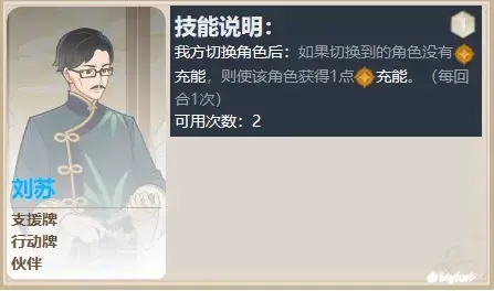 评价:T1.充能卡,借用单位价值论的概念,刘苏几乎是等效1骰挣至少4费,当回合即可回本。刘苏的存在使得各种追求2回合开q的速攻队在首回合有了开q变速或者打出更多资源卡的余地(例如行秋首发,打出刘苏后切至宵宫,2费挣1点充能,留出了1费),也让各种otk队拥有了首回合造成减员的可能性(2充角色首回合打出切eq),在几乎任何阵容中都有一席之地,可以无脑带满。而它与田铁嘴的异同上文已经提到,在此就不赘述了。