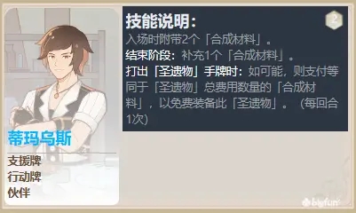评价:T2。在装备篇中我们提到,如今的圣遗物中除了个别圣遗物外,大多数都是废卡,而一场对局中需要用到的往往也就1件圣遗物而已,在大多数情况下与其使用蒂玛乌斯不如直接使用对应圣遗物,蒂玛乌斯唯一的使用情景似乎也就只有动辄七八回合起步的做饭队。