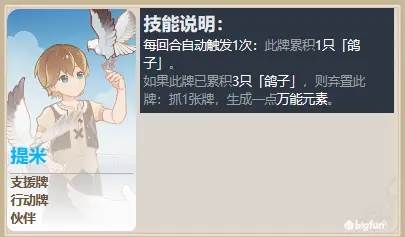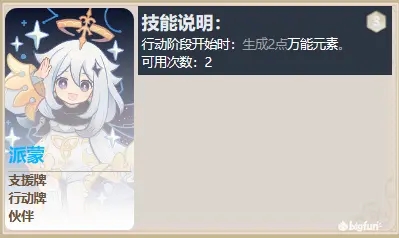 评价:快攻队T1.5,在中慢速队伍中为T1。又称大派蒙,一张很典型的资源型蓄爆卡,不论是在快攻、中速、还是慢速队伍中均有应用。打3、2回合回4让它看上去在赚取资源的效率上和其他资源卡相比没有太大区分度,但如果把大派蒙理解为迅速回收无用骰子抢先手、并为下两回合提供准备蓄爆型卡牌的话,它的强势之处方能展现——连续两回合的10骰,不管是在快攻还是中慢速队伍中,都能带来质变。但值得注意的是,虽然快攻队伍虽然可带,但几乎只有在第一回合打出才有意义,往后大派蒙只能是一张优秀的调和牌且哪怕在第一回合抽到,如果压力较大依然不建议打出。