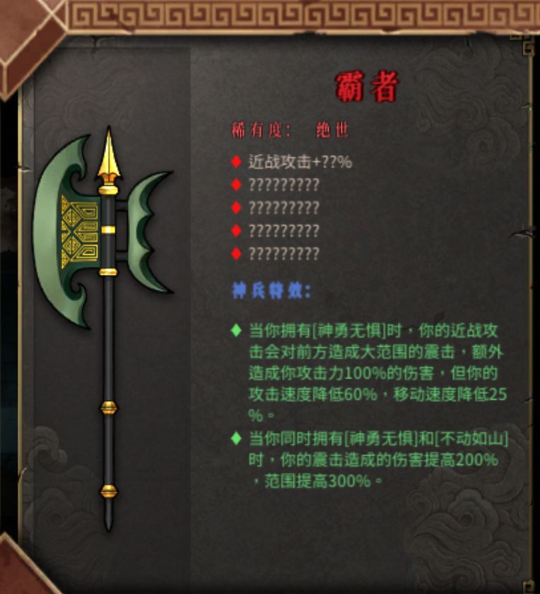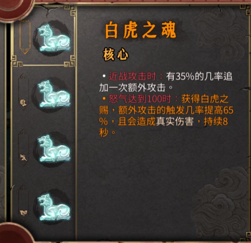 当你同时拥有神勇无惧,不动如山时,配合冷血,虎王,你将拥有一击致命的能力。