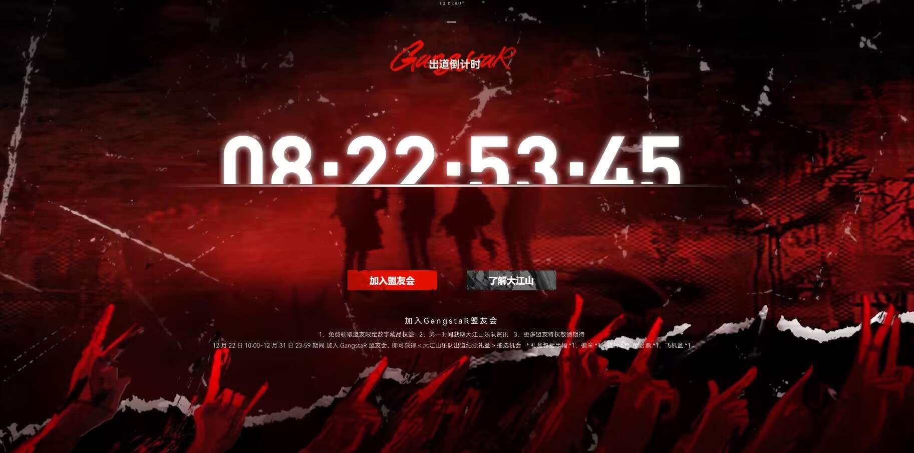 12 月22 日 10:00-12 月 31日 23:59 期间 加入 GangstaR 盟友会,即可获得<大江山乐队出道纪念礼盒> 抽选机会·礼盒包括手幅*1,徽章*1,挂件*1,镭射票*1,飞机盒*1
