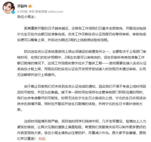 由于截止目前我们仍未收到实名认证完成的通知,因此我们不得不考虑上线时间延迟的可能性,并且为此备案。接下来一段时间在保持与主管审核部门积极沟通的同时,我们也会考虑最坏的可能性,如若无法在宁北生日之前成功上线,宁北的生日庆祝活动将会在微博开展,同时在开服后开放生日剧情的体验,并将宁北的生日卡面补偿给大家。