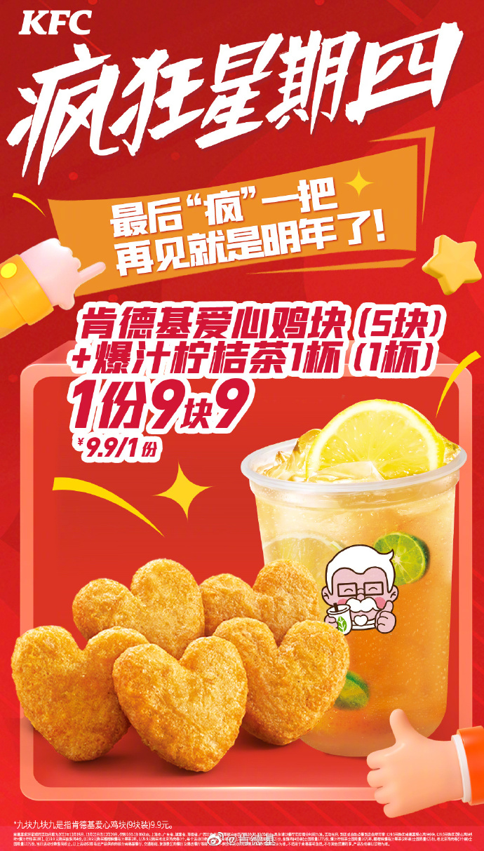 小食配饮料【爱心鸡块(5块)】+【爆汁柠桔茶(1杯)】1份9块9;