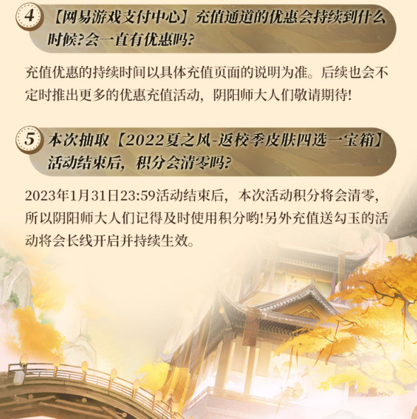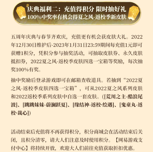 2022年12月30日维护后-2023年1月31日23:59,大人们可通过“网易游戏支付中心”充值获取积分并参与抽奖活动,可抽取[皮肤券]、[皮肤抵扣券]、[2022夏之风-返校季四选一宝箱]等奖励,中奖率百分百哦!