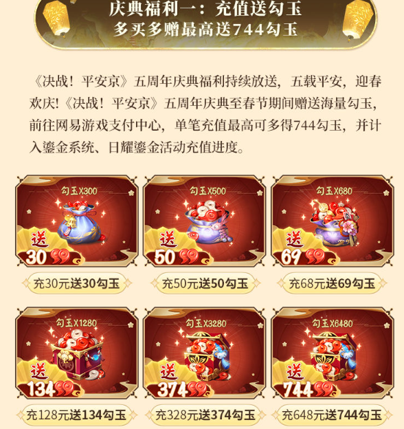 3.网易游戏支付中心将持续开放!《决战!平安京》赠送海量勾玉,单笔充值最高可多得744勾玉,并计入鎏金系统、日耀鎏金活动充值进度。