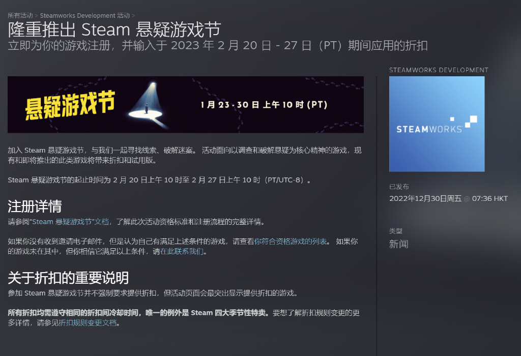 以上就是手游巴士为您提供《Steam悬疑游戏节什么时候开始 Steam悬疑游戏节时间》的详细内容,更多精彩内容请继续阅读上一篇《宝可梦朱紫闪焰王牌简单打法 宝可梦朱紫闪焰王牌简单怎么打》2022-12-30 使魔计划最强阵容是什么
