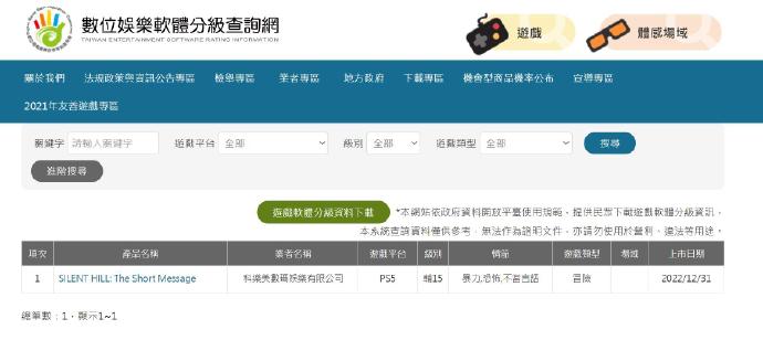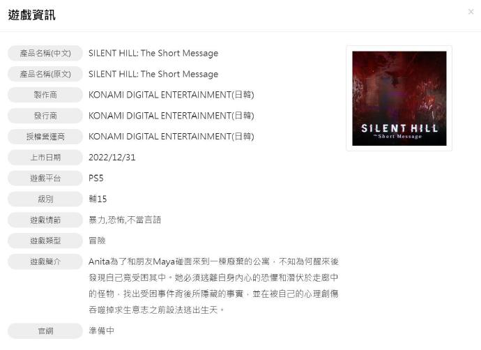 目前可以在台湾“数位娱乐软体分级查询网”上搜索到《寂静岭:短消息》的更多介绍内容,其中不仅显示了该游戏的开发商、发行商、分级信息,还有这款游戏的剧情简介和封面图片。
