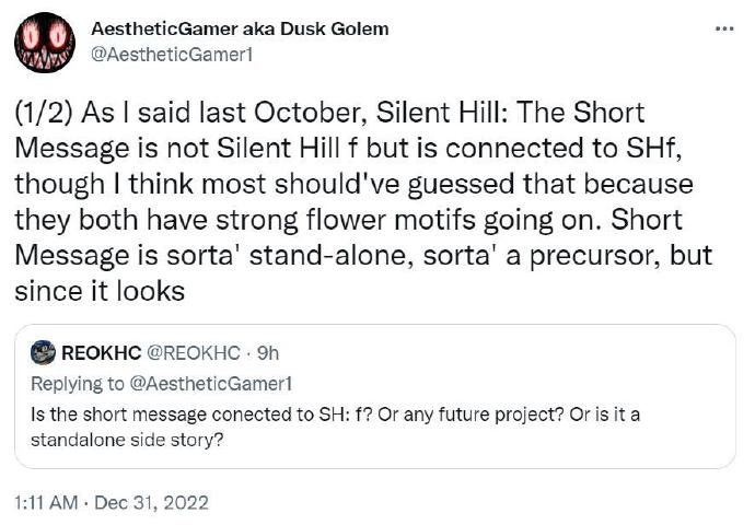 爆料人Dusk Golem表示,《寂静岭:短消息》正是他在几个月前透露的代号为“樱花”的寂静岭新作,它不是科乐美正式公开的《寂静岭f》,不过二者之间存在一些联系。