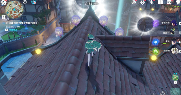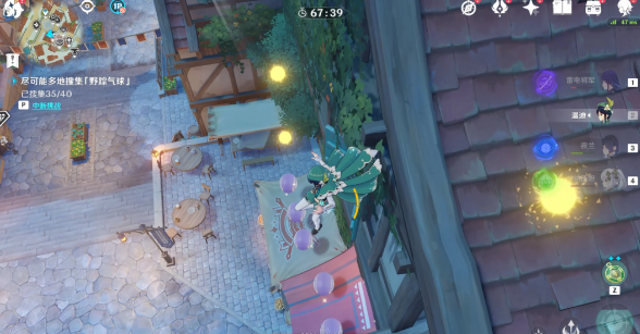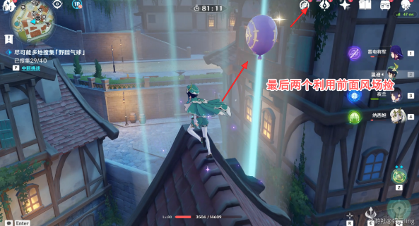 4、收集后从屋子上看向西南方,利用加速带飞到对面拿到三个气球,到达黄色气球边