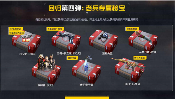 6. 老兵专属礼包,我们每天游戏一局可以开启一个宝箱,上线是五次获得的道具不会重复。