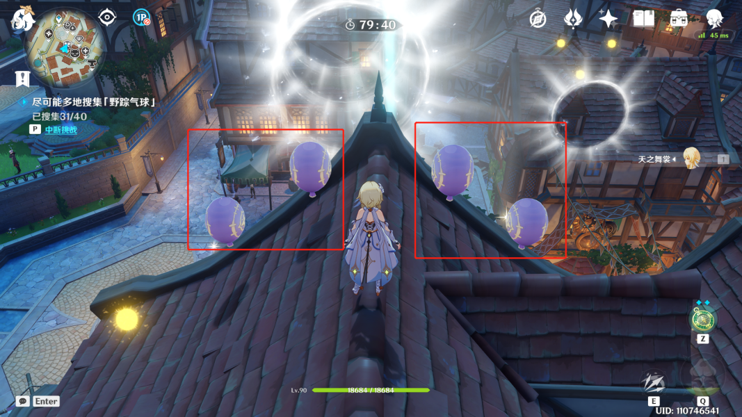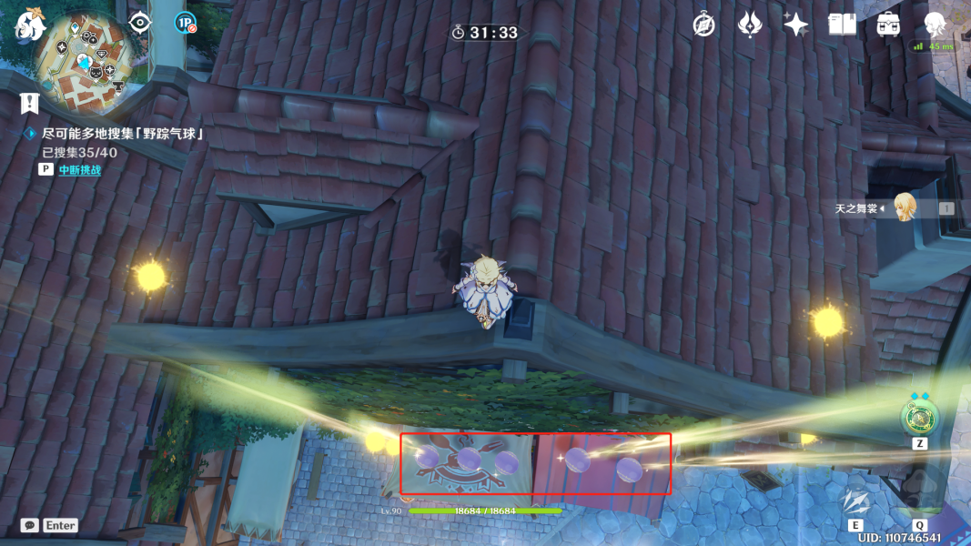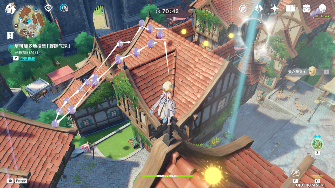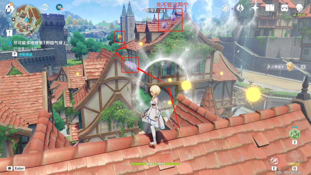 2. 接着我们穿过加速风场到对面屋顶拾取3个紫球,再跟着红色路线指示去捡橙色的球。