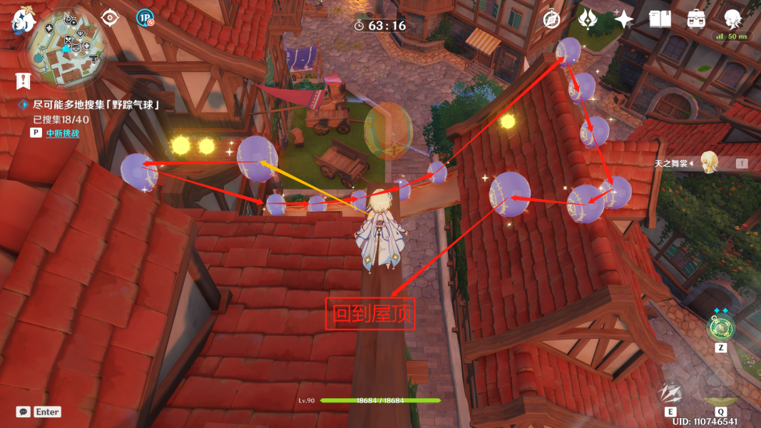 3. 拾取完橙色的球,会出现13个紫球,按照上图红、黄色指示,从左边出发,速度要快。最后回到屋顶。