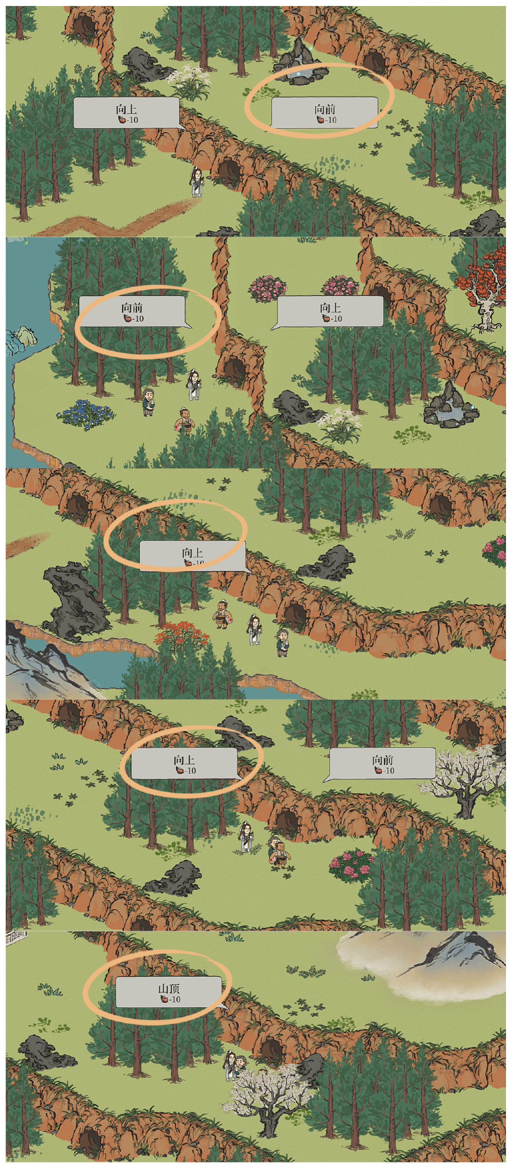 登山顺序:向前→向前→向上→向上→山顶