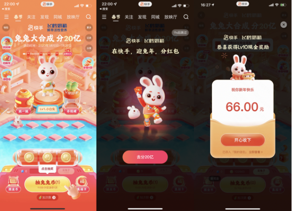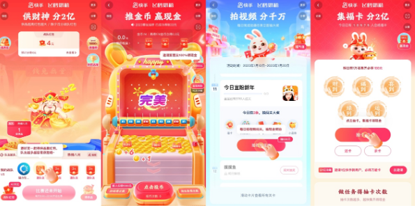 “集福卡”经典玩法也创新回归,集齐财到、福到、喜到、缘到、运到5种福卡,即可参与瓜分1亿现金奖励,过程中还有万能卡、沾沾卡全面助力。福卡合成后就可开启福兔卡集卡任务,完成后在除夕夜再瓜分1亿现金,前1万名集齐必得666元红包,还有视频会员、百元话费等随机奖励可领。