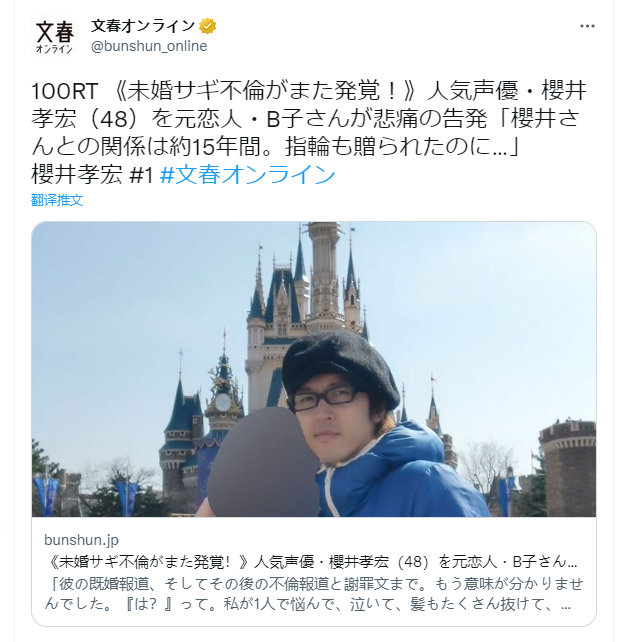 B子向文春展示了两人去迪士尼的合照、亲密照片、樱井孝宏结婚后第7天发给她的调情邮件、以及去年被文春曝光出轨A子后的道歉邮件等。