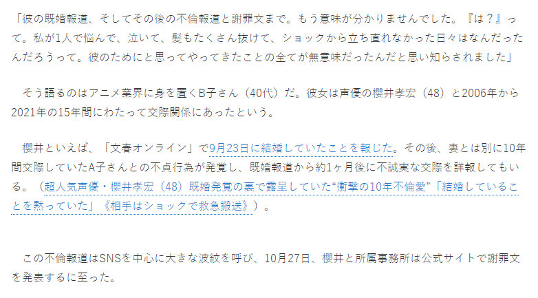 交往期间、B子曾在樱井孝宏的手机邮件文件夹里发现了和他频繁对话称呼亲密的知名X声优的名字、以及许多其他女性的名字、在传出樱井孝宏和X声优分手后B子终于放下心来、但后来却又传出与声优养成所的同级生Y子交往并结婚的消息、B子因为爱犬的离世和樱井孝宏的背叛让她身心俱疲、开始掉头发、终于B子在樱井孝宏47岁生日时通过邮件与他分手、直到去年文春报道了A子的消息后、B子才恍然大悟向樱井孝宏提出补偿。