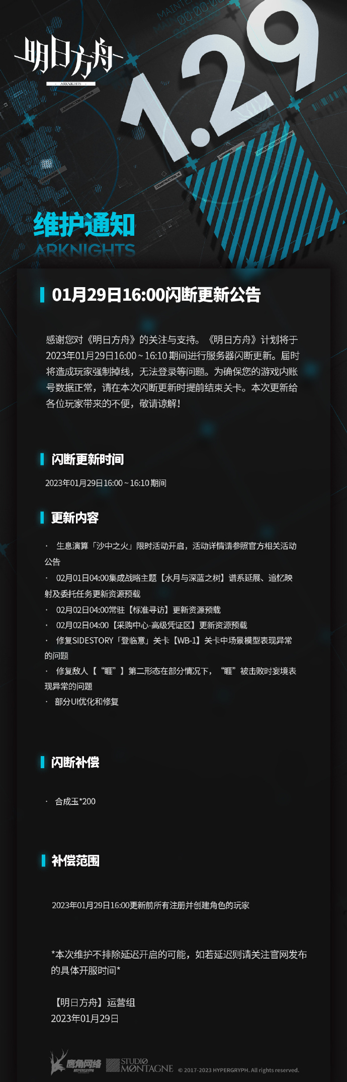 以上就是手游巴士为您提供《明日方舟01月29日更新内容介绍 明日方舟01月29日有哪些更新内容》的详细内容,更多精彩内容请继续阅读上一篇《火焰纹章engage动物有什么用 火焰纹章engage牧场产出什么》2023-01-29 风帆纪元造船必出茶船配方是什么 风帆纪元造船必出茶船配方分享