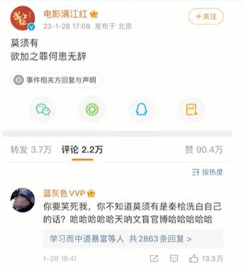 电影《满江红》官博用秦桧语录喊冤,典故中秦桧以“莫须有”的罪名杀害民族英雄岳飞父子,而这部拍岳飞事迹的电影官博却用“莫须有”喊冤,一句“莫须有“让大家不得不怀疑官博的操控者其实是秦桧本人。