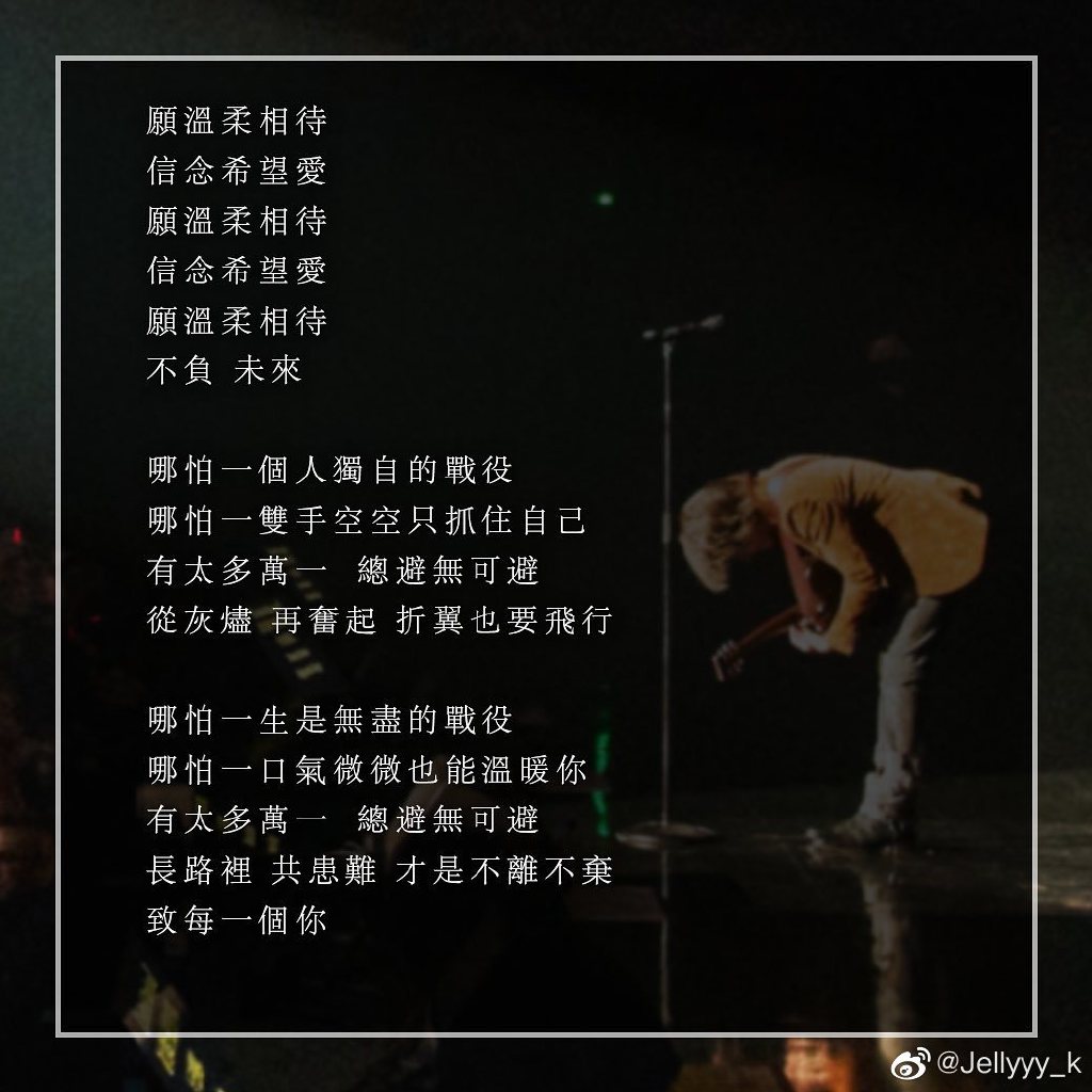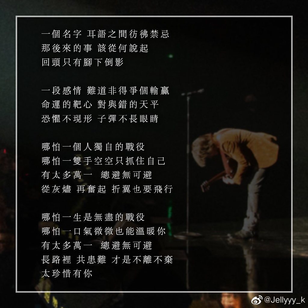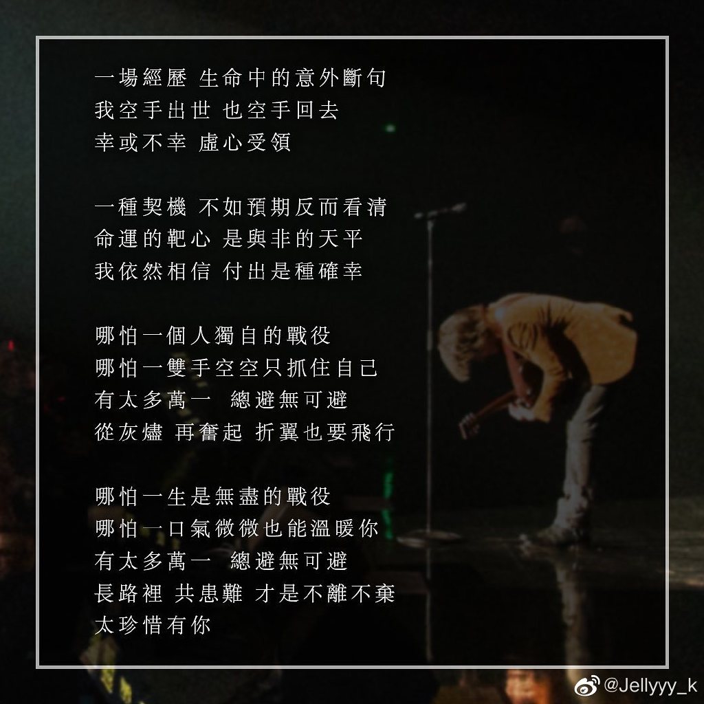 许多段歌词都戳中每一个人内心最柔软的地方:“恐惧不现形,子弹不长眼睛”;“哪怕一个人独自的战役,哪怕一双手空空只抓住自己,有太多万一,总避无可避,从灰烬,再奋起,折翼也要飞行”;“哪怕一生是无尽的战役,哪怕一口气微微也能温暖你,有太多万一,总避无可避,长路里,共患难,才是不离不弃,太珍惜有你”;“命运的靶心,是与非的天平,我依然相信 付出是种确幸。”
