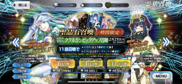 2月7日日服UP从者更换为五星从者库库尔坎和四星从者雨神。
