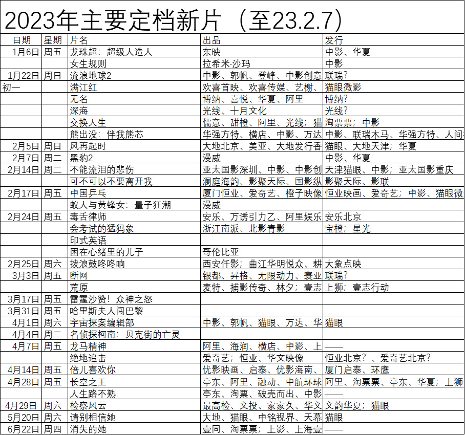 2023-02-07 2023上半年已定档40部新片 2023上半年定档电影有哪些