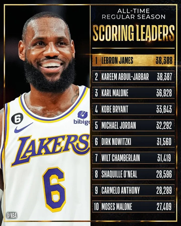 38岁的老詹没有让大家的希望落空,职业生涯常规赛总得分超过38387分,登上历史得分榜榜首。