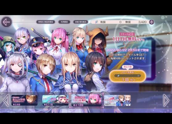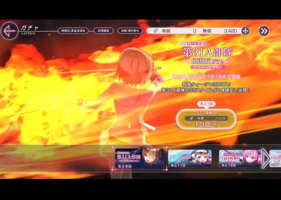现在展现的是新手注册后7日内可用限定氪金池,用氪金的3000石抽有31A六位角色的原皮SS十连,保底1SS,只有一次机会,这个可以不用纳入初始范围