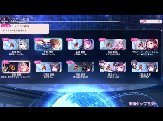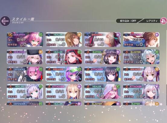 番外1:如果想再详细检查一下刚刚的抽奖成果,可以点击“スタイル(战型,这里是角色卡牌的收集信息)”,按“レアリティ”(实力),并让排序箭头朝下形成“从强到弱”的排序。