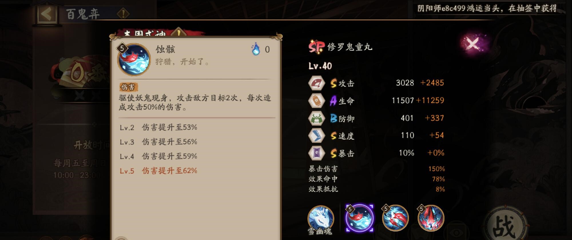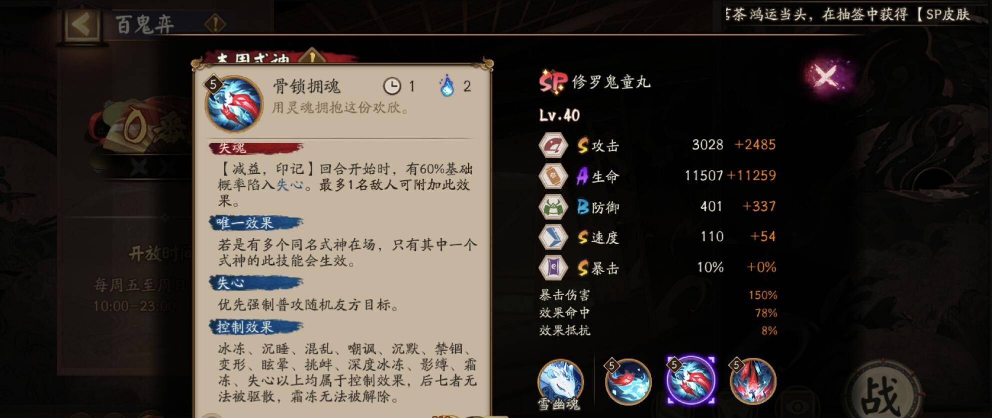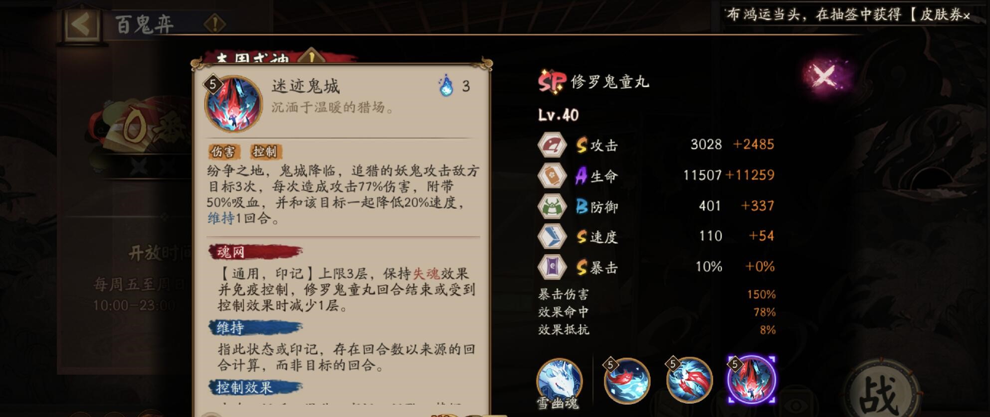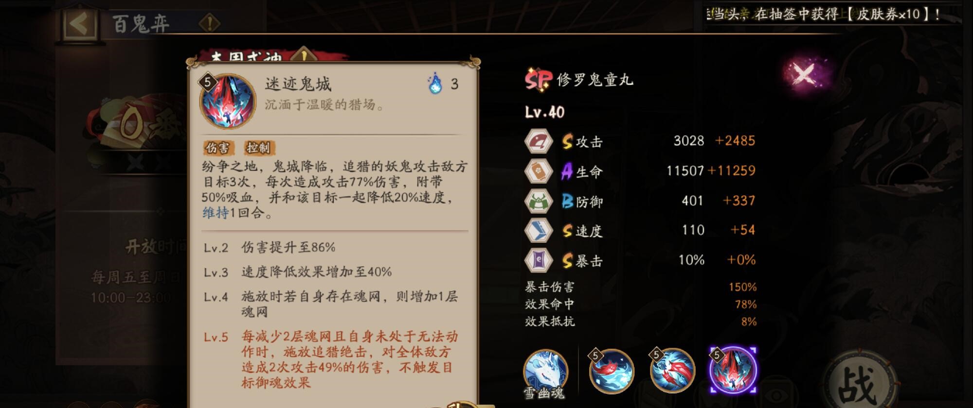 纷争之地,鬼城降临,追猎的妖鬼攻击敌方目标3次,每次造成攻击77%伤害,附带50%吸血,并和该目标一起降低20%速度,维持1回合。