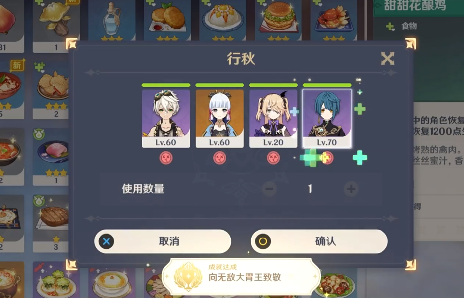 1.首先,将队伍中的角色血量耗尽后喂一个血量增加最少的食物。
