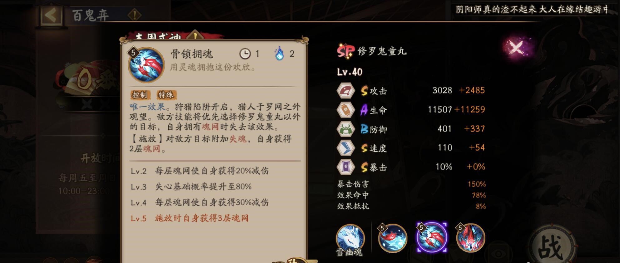 唯一效果。狩猎陷阱开启,猎人于罗网之外观望。敌方技能将优先选择修罗鬼童丸以外的目标,自身拥有魂网时失去该效果。【施放】对敌方目标附加失魂,自身获得2层魂网。