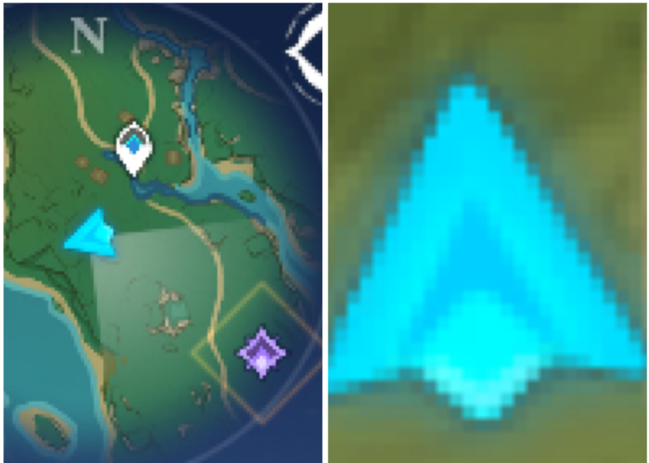 代表玩家自身位置的锐三角箭头,箭头朝向代表人物面朝方向,白色光芒照到的方向是当前玩家视野朝向;大三角里还有一个小三角,用来进行更精确的定位,是角色实际所在位置。