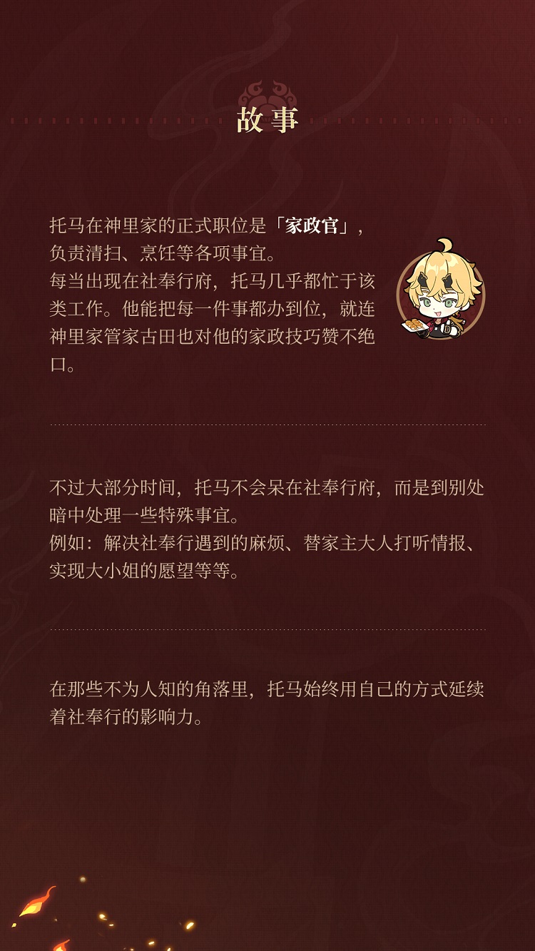 托马在神里家的正式职位是「家政官」,负责清扫、烹饪等各项事宜。