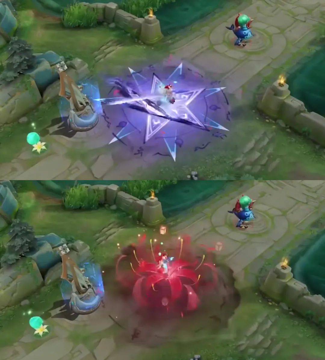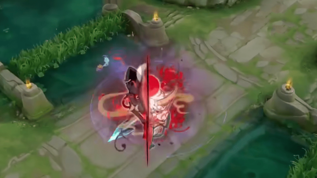 被动和大招的七星光芒剑,好像有两套展示特效。一个是五角星套七芒星的设定,颜色是紫色的。另一个是深红色的特效,会出现一朵彼岸花。紫色的还有看不懂的符文,感觉像是封印,而彼岸花开更像是解封。