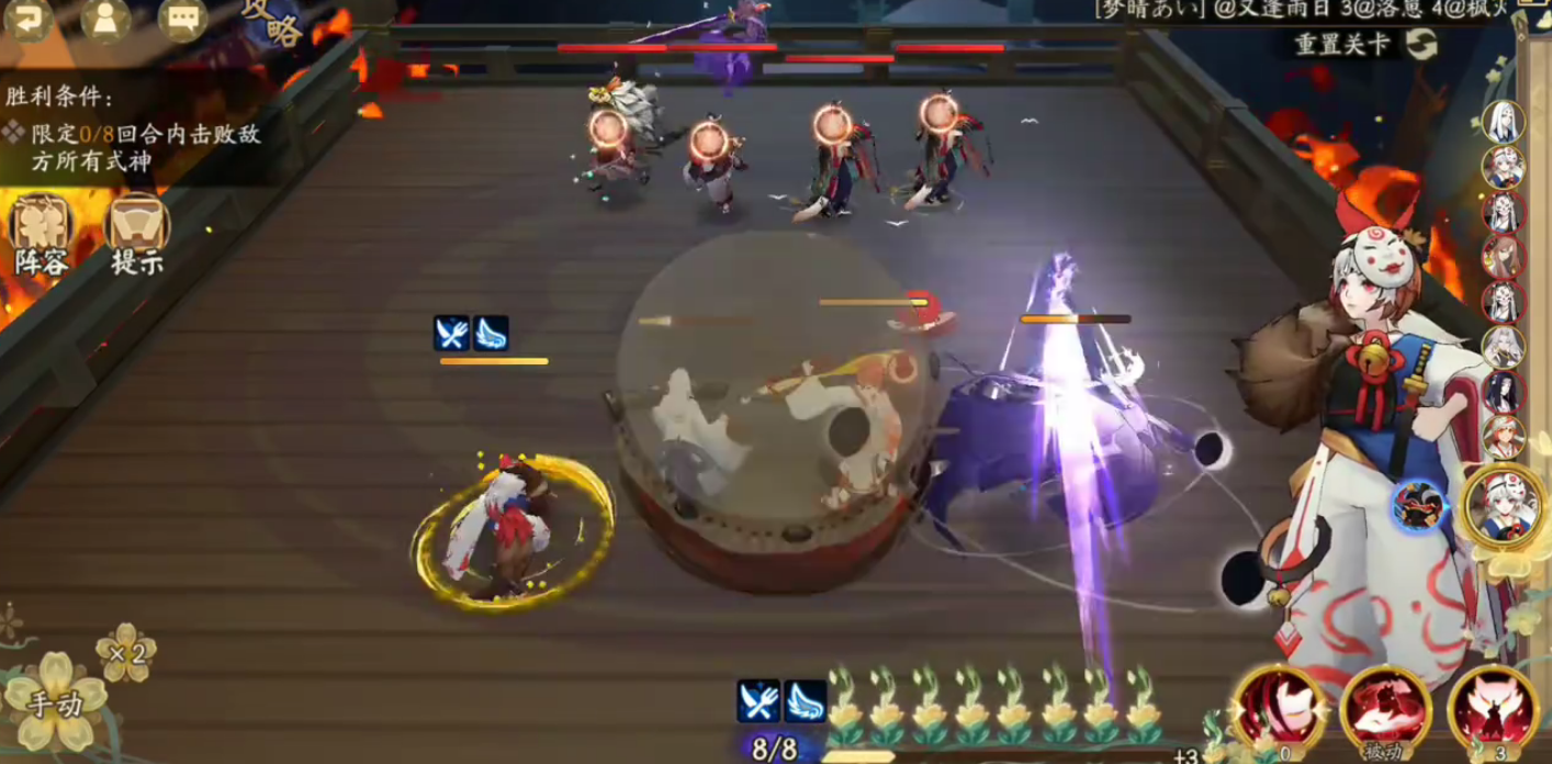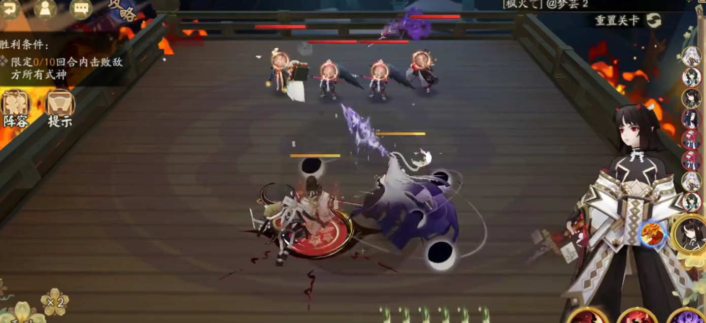 三段(敌方从左到右):泷夜叉姬(破势);御怨般若(招财猫); 座敷童子(三味);一目连(涅磐之火)